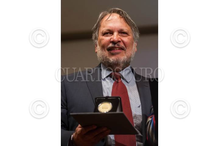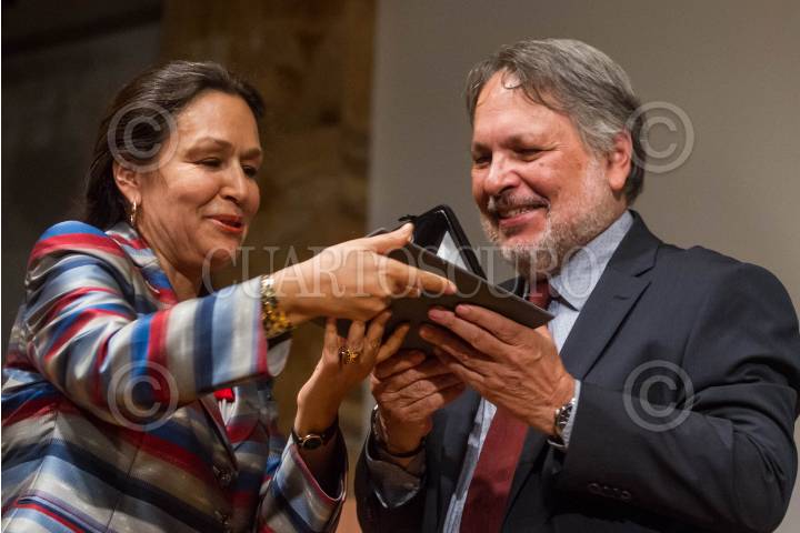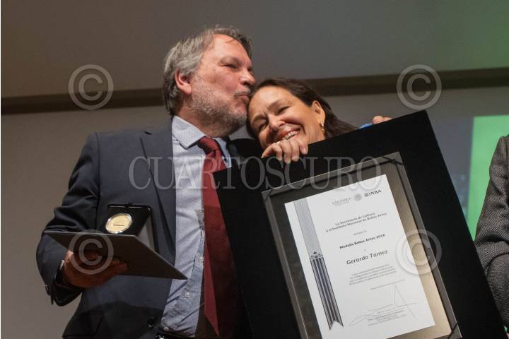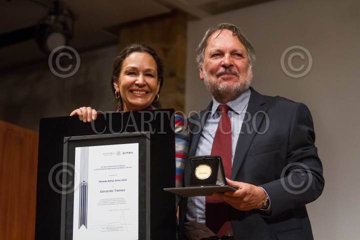 CIUDAD DE MÉXICO, 20AGOSTO2018.- El músico Gerardo Tamez fue reconocido con la medalla Bellas Artes 2018, la cual le fue entregada por Lidia Camacho, directora del Instituto Nacional de Bellas Artes, en una ceremonia en la sala Manuel M. Ponce. FOTO: ISAAC ESQUIVEL /CUARTOSCURO. COM