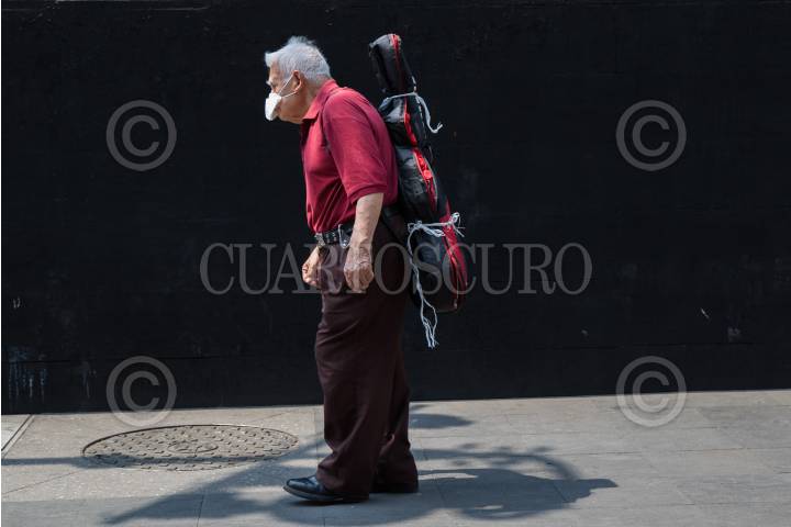 Un hombre de la tercera edad inicia su jornada en el centro histórico en donde se gana la vida interpretando canciones.