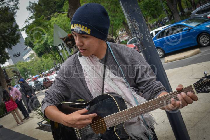 Un joven guitarrista en compañía de su gatito interpreta canciones sobre avenida Juárez en el centro histórico.