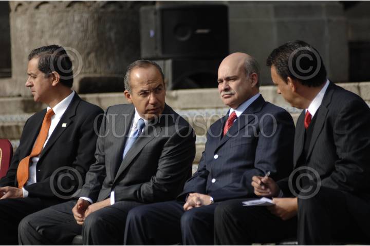 MÉXICO,D.F30NOVIEMBRE2007.- Juan Rafael Elvira titular de la Semarnat,Felipe Calderon Hinojosa presidente de los Stados Unidos Mexicanos Eduardo Sojo secretario de economia, Humberto Moreira Gobernador de Coahuila, durante la presentación del primer vehículo híbrido producido en México por el complejop Automotriz GM. FOTO: IVAN MENDEZ/CUARTOSCURO.COM