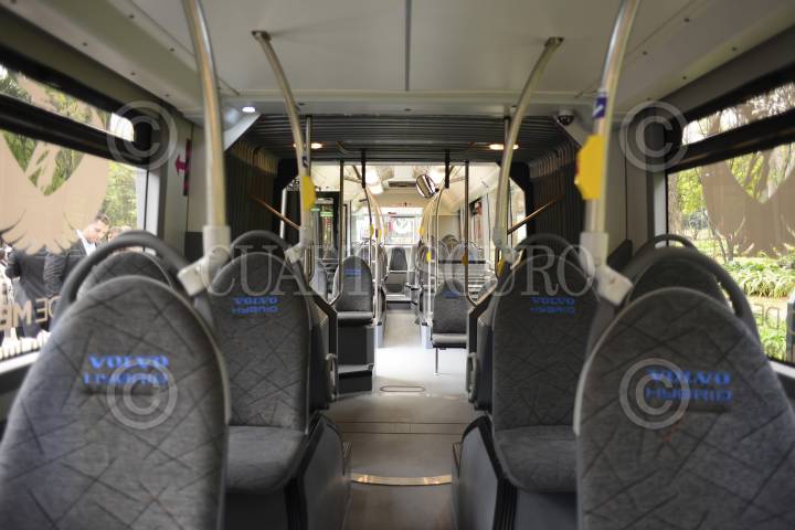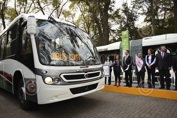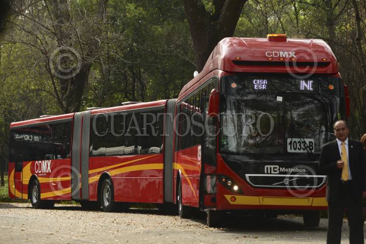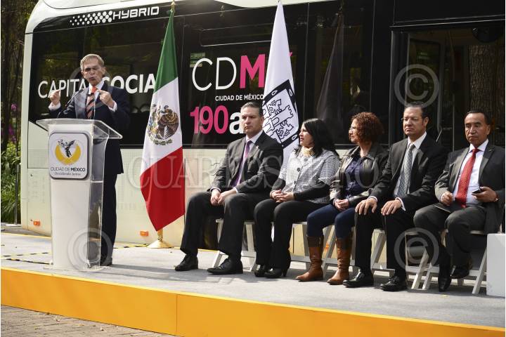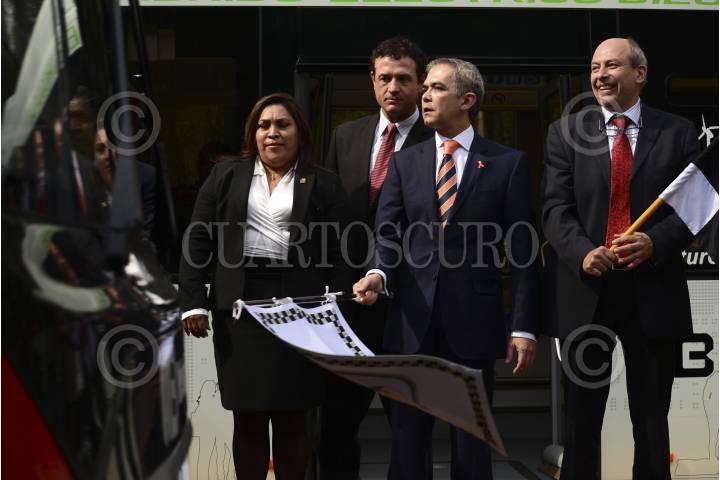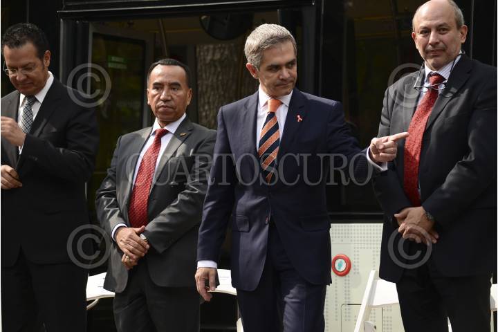 MÉXICO, D.F., 10DICIEMBRE2014.- El jefe de gobierno del Distrito Federal, Miguel Ángel Mancera Espinosa presidio la presentación de 9 metro-buses que pondrá en circulación en la línea 1 del sistema de transporte MB, la cual transporta diariamente a más de 450 mil personas, esto pretende contribuir a la mejora del servicio en horas pico. También se presentó un metro-bus híbrido que no daña en medio ambiente. FOTO: ISABEL MATEOS /CUARTOSCURO.COM