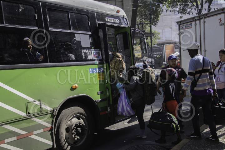 Mujer y su bebé mientras suben a autobus del Gobierno de la Ciudad con dirección a un albergue.