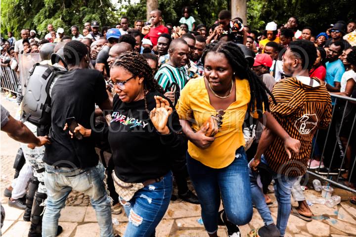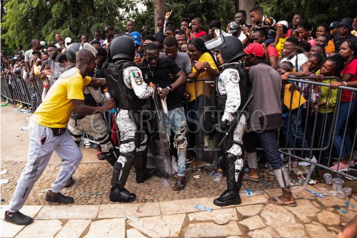 TAPACHULA, CHIAPAS, 17OCTUBRE2023.- Migrantes, en su mayoría haitianos, tiraron las as rejas que resguardaban las oficinas de la Comisión Mexicana de Ayuda Refugiados (COMAR), entre gritos y empujones algunas personas lograron ingresar hasta las puertas de está oficina de migración para exigir un documento que les permita regularizar su estancia en el país para así continuar su camino hacia los Estados Unidos, los pocos elementos de la Guardia Nacional que cuidaban el sitio nada pudieron hacer ante el embate de los migrantes. FOTO: DAMIÁN SÁNCHEZ/CUARTOSCURO.COM
