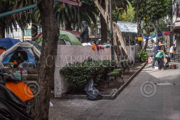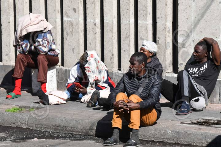 CIUDAD DE MÉXICO, 23DICIEMBRE2023.- En vísperas de las fiestas decembrinas decenas de migrantes, la mayoría haitianos permanecen en la Plaza Giordano Bruno "La pequeña Haití” de la colonia Juárez, en las cercanías de la Comisión Mexicana de Ayuda a Refugiados (COMAR). En la imagen, cuatro migrantes permanecen en una zona para tomar el sol. FOTO: MARIO JASSO/CUARTOSCURO.COM