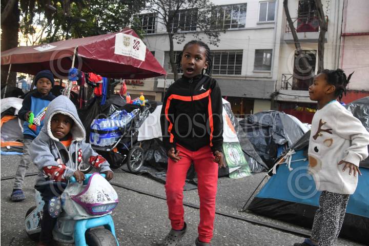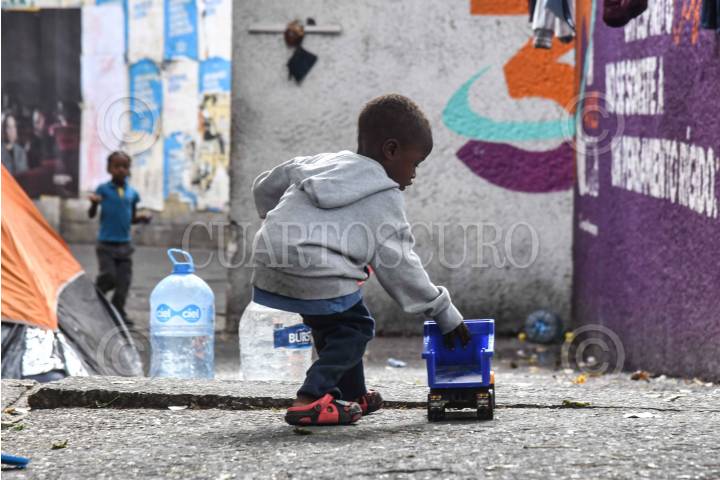 CIUDAD DE MÉXICO, 23DICIEMBRE2023.- En vísperas de las fiestas decembrinas decenas de migrantes, la mayoría haitianos permanecen en la Plaza Giordano Bruno "La pequeña Haití” de la colonia Juárez, en las cercanías de la Comisión Mexicana de Ayuda a Refugiados (COMAR). En la imagen, un niños haitiano se divierten jugando. FOTO: MARIO JASSO/CUARTOSCURO.COM
