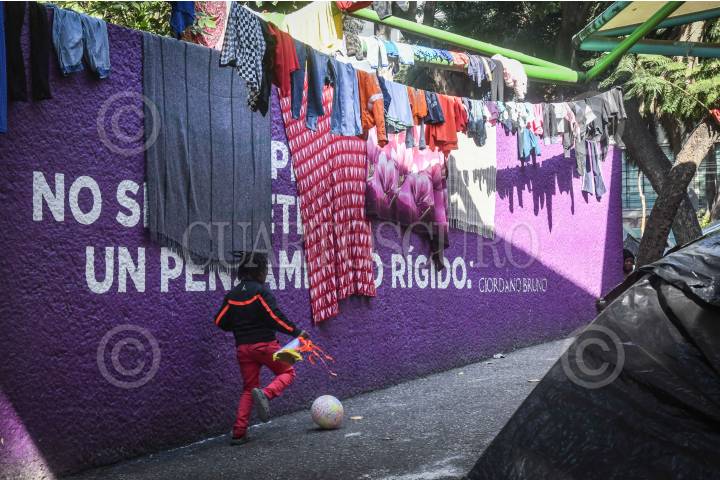 CIUDAD DE MÉXICO, 23DICIEMBRE2023.- En vísperas de las fiestas decembrinas decenas de migrantes, la mayoría haitianos permanecen en la Plaza Giordano Bruno "La pequeña Haití” de la colonia Juárez, en las cercanías de la Comisión Mexicana de Ayuda a Refugiados (COMAR). En la imagen, un niño haitiano juega con una pelota. FOTO: MARIO JASSO/CUARTOSCURO.COM