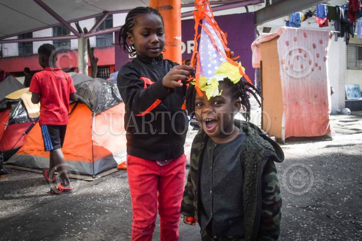CIUDAD DE MÉXICO, 23DICIEMBRE2023.- En vísperas de las fiestas decembrinas decenas de migrantes, la mayoría haitianos permanecen en la Plaza Giordano Bruno "La pequeña Haití” de la colonia Juárez, en las cercanías de la Comisión Mexicana de Ayuda a Refugiados (COMAR). En la imagen, un niño haitiano le coloca un pico de piñata simulando un sombrero a otro menor. FOTO: MARIO JASSO/CUARTOSCURO.COM