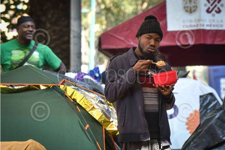 CIUDAD DE MÉXICO, 23DICIEMBRE2023.- En vísperas de las fiestas decembrinas decenas de migrantes, la mayoría haitianos permanecen en la Plaza Giordano Bruno "La pequeña Haití” de la colonia Juárez, en las cercanías de la Comisión Mexicana de Ayuda a Refugiados (COMAR). En la imagen, un hombre haitiano degusta un desayuno. FOTO: MARIO JASSO/CUARTOSCURO.COM