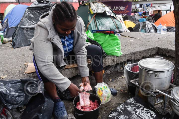 CIUDAD DE MÉXICO, 24DICIEMBRE2023.- En la víspera de navidad, migrantes haitianos preparan sus alimentos en la Plaza Giordano Bruno, denominada "La pequeña Haití” de la colonia Juárez. FOTO: MARIO JASSO/CUARTOSCURO.COM