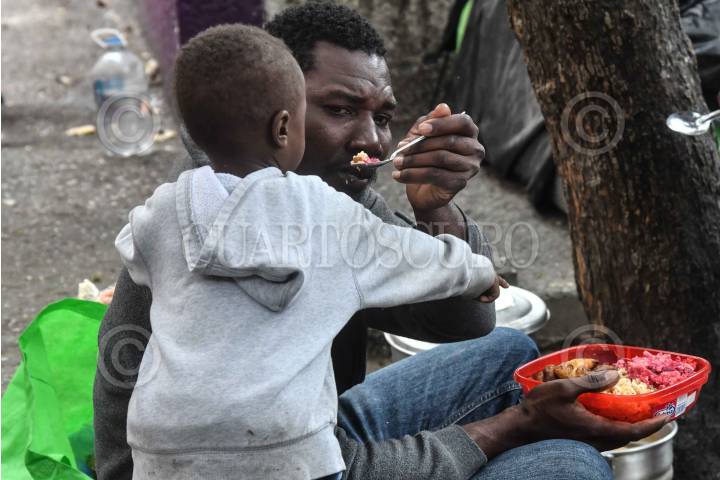 CIUDAD DE MÉXICO, 24DICIEMBRE2023.- En la víspera de navidad, migrantes haitianos preparan sus alimentos en la Plaza Giordano Bruno, denominada "La pequeña Haití” de la colonia Juárez. En la imagen, un hombre alimenta a un menor. FOTO: MARIO JASSO/CUARTOSCURO.COM