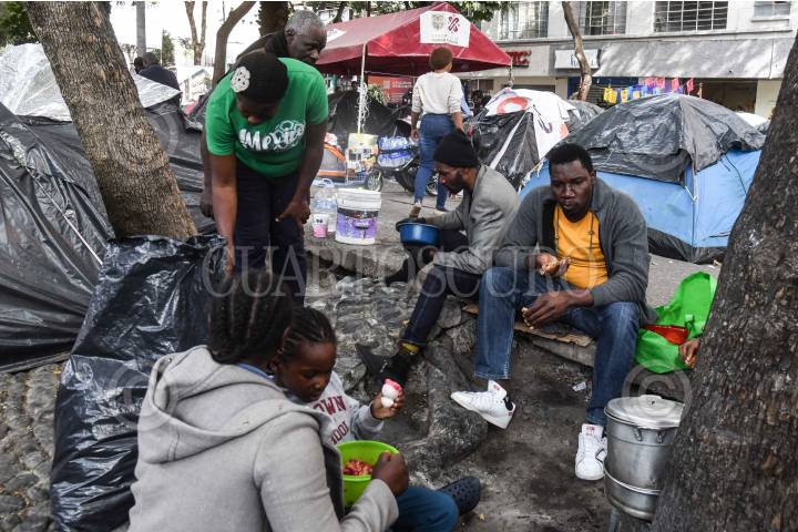 CIUDAD DE MÉXICO, 24DICIEMBRE2023.- En la víspera de navidad, migrantes haitianos preparan y degustan sus alimentos en la Plaza Giordano Bruno, denominada "La pequeña Haití” de la colonia Juárez. FOTO: MARIO JASSO/CUARTOSCURO.COM
