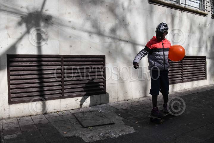CIUDAD DE MÉXICO, 24DICIEMBRE2023.- En la víspera de navidad, migrantes haitianos preparan sus alimentos en la Plaza Giordano Bruno, denominada "La pequeña Haití” de la colonia Juárez. En la imagen, un niños haitiano se divierte patinando. FOTO: MARIO JASSO/CUARTOSCURO.COM