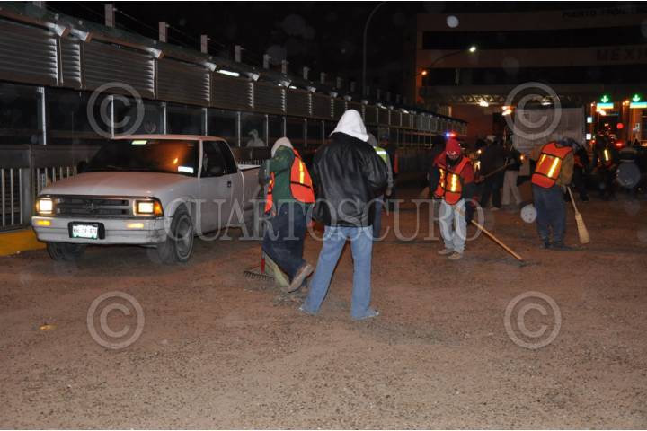 NUEVO LAREDO, TAMAULIPAS, 04ENERO2011.- Brigadas municipales rocían antiderrapante en los puentes internacionales ya que el asfalto fue cubierto por una capa de hielo en horas de la madrugada y permitir el trafico vehicular internacional, las principales vialidades de la ciudad fueron bloqueadas por elementos del cuerpo de tránsito al igual que los pasos a desnivel para evitar accidentes a los conductores lo que tenía parcialmente paralizada a la ciudad hasta este mediodía. FOTO: JOAQUIN MURRIETA/CUARTOSCURO.COM