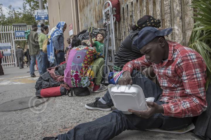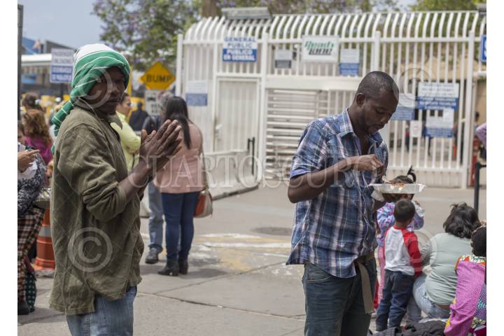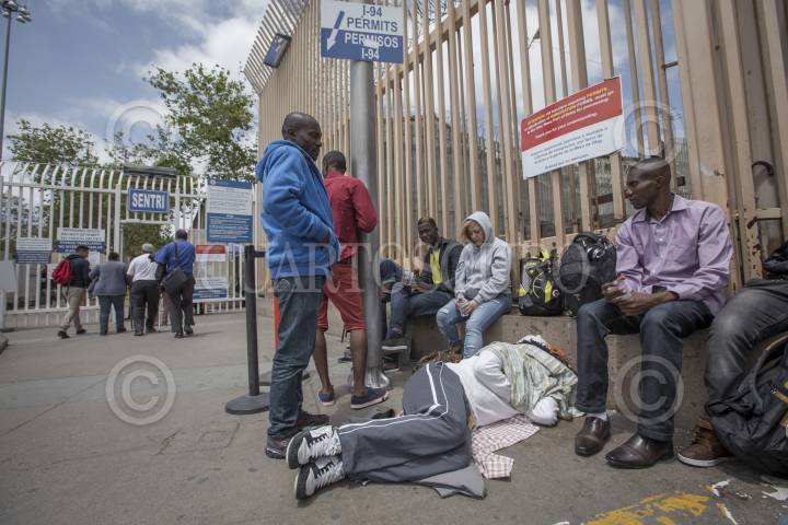 TIJUANA, BAJA CALIFORNIA, 26MAYO2016.- Cientos de Africanos y haitianos llegaron a Tijuana para pedir asilo político a Estados Unidos. Se estima que el grupo de extranjeros acudieron a temprana hora a las inmediaciones de la garita peatonal de San Ysidro, con la intensión de poder ser entrevistados por los oficiales migratorios. De acuerdo al cónsul de Estados Unidos en Tijuana, algunos de ellos ya se encuentran en territorio estadounidense, además comentó que se estiman que son cerca de 600 las personas que han solicitado refugio debido a que vienen huyendo de la situación económica, política y social de sus países. Algunos de los integrantes del grupo de migrantes comentaron que realizaron una largo viaje de tres meses para llegar hasta esta frontera, atravesando algunos países centroamericanos y todo el territorio nacional. FOTO: CHRISTIAN SERNA /CUARTOSCURO.COM