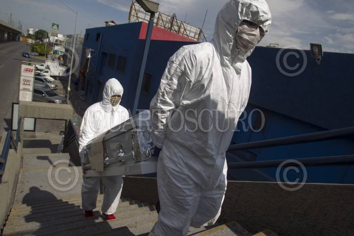 MONTERREY, NUEVO LEÓN, 17ABRIL2020.- Un ataúd con la frase "encerrado o enterrado" es llevado en estaciones del metro de Monterrey por integrantes de la asociación "Haz que suceda" fundada por Candelario Maldonado como parte de la campaña de concientización para quedarse en casa durante la emergencia santaria por el coronavirus covid-19. FOTO: GABRIELA PÉREZ MONTIEL / CUARTOSCURO.COM