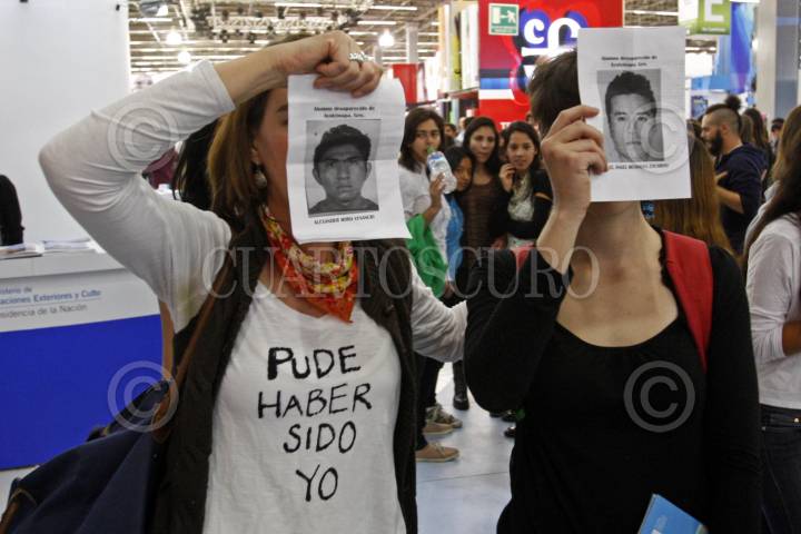 GUADALAJARA, JALISCO, 03DICIEMBRE2014.- Esta tarde dentro de las instalaciones de la Expo en donde se desarrolla la Feria Internacional del Libro de Guadalajara 2014 (FIL), un grupo de ciudadanos manifestó su repudio al gobierno en turno y a los hechos violentos sucedidos el pasado 26 de septiembre en Iguala Guerrero contra normalistas de Ayotzinapa. FOTO: FERNANDO CARRANZA GARCIA / CUARTOSCURO.COM