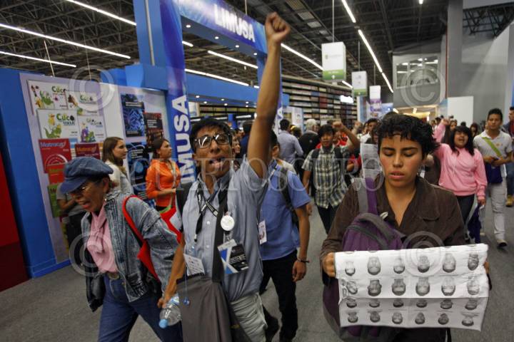 GUADALAJARA, JALISCO, 03DICIEMBRE2014.- Esta tarde dentro de las instalaciones de la Expo en donde se desarrolla la Feria Internacional del Libro de Guadalajara 2014 (FIL), un grupo de estudiantes recorrió los pasillos de la Feria, manifestando su repudio a los hechos violentos sucedidos el pasado 26 de septiembre en Iguala Guerrero contra normalistas de Ayotzinapa. FOTO: FERNANDO CARRANZA GARCIA / CUARTOSCURO.COM