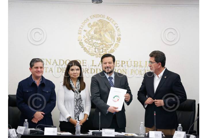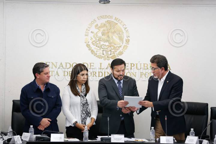CIUDAD DE MÉXICO, 21MARZO2017.- El senador Héctor Yunes Landa le entregó el dictamen de elegibilidad de los aspirantes al cargo de titular de la Fiscalía Especializada para la Atención de Delitos Relacionados con Hechos de Corrupción a Fernando Herrera, presidente de la Junta de Coordinación Política del Senado de la República. FOTO: CUARTOSCURO.COM