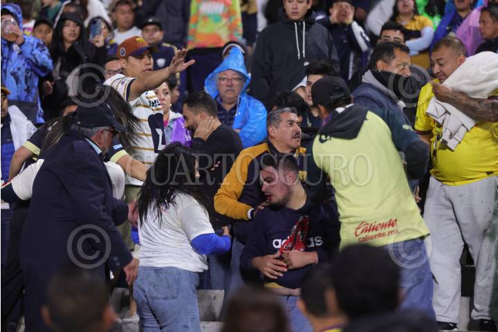 CIUDAD DE MÉXICO, 22FEBRERO2025. Gresca entre aficionados durante el partido de fútbol Pumas vs América correspondiente a la jornada 8 del Torneo Clausura 2025 de Liga BBVA MX, en el Estadio Olímpico Universitario. FOTO: EDGAR NEGRETE LIRA/CUARTOSCURO.COM