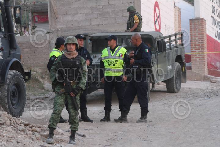 SAN VICENTE CHICOLOAPAN, ESTADO DE MÉXICO, 26MARZO2019.- Militares y policías municipales reguardan las calles después de que se registrara una fuerte explosión al oriente del Valle de México, el estallido ocurrió en al menos dos talleres de cohetes ubicados entre los municipios de Chimalhuacán y San Vicente Chicoloapan. No se reportan heridos, ni personas fallecidas. FOTO: ROGELIO MORALES /CUARTOSCURO. COM