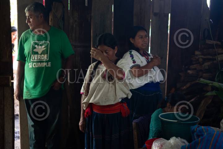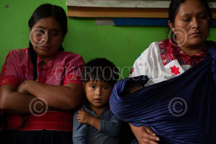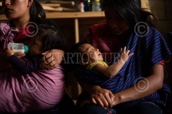 Mujeres sostienen y alimentan a sus hijos en el lugar de resguardo de 15 familias desplazadas.