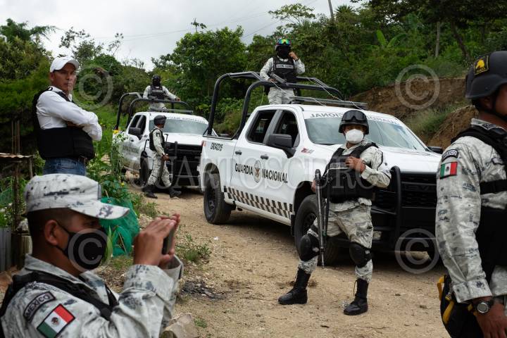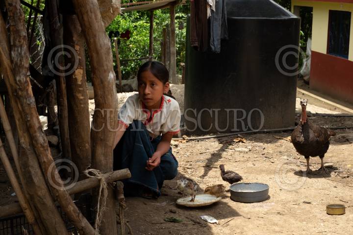 Una niña alimenta a sus animales mientras la Guardia Nacional recorre su comunidad.
