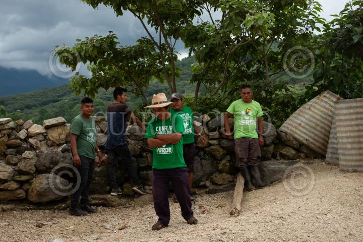 Autoridades de la comunidad de frente a la pared de piedras creada para proteger a los niños de los disparos Tabak.