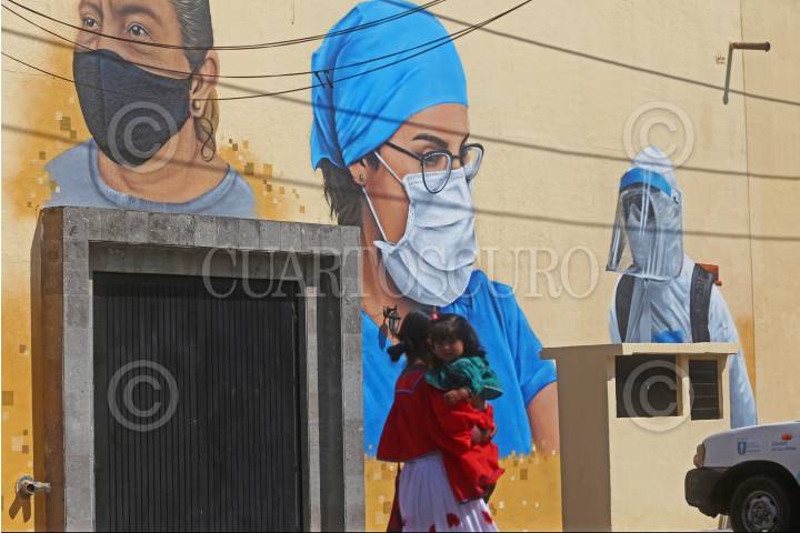 Una mujer de origen Wirrarica y su pequeña hija con cubrebocas, caminan por el centro de Zapopan, al fondo se observa el mural Los héroes de la pandemia por Covid-19, una obra que conmemora y reconoce al personal que participa en esta contingencia.