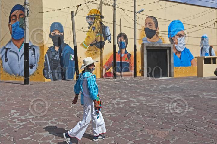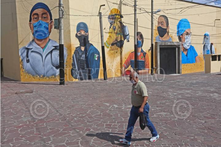 Un hombre con cubrebocas, caminan por el centro de Zapopan, al fondo se observa el mural Los héroes de la pandemia por Covid-19, una obra que conmemora y reconoce al personal que participa en esta contingencia.