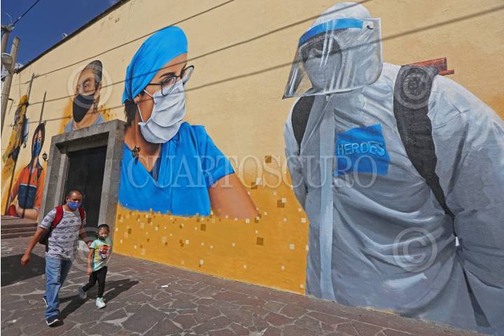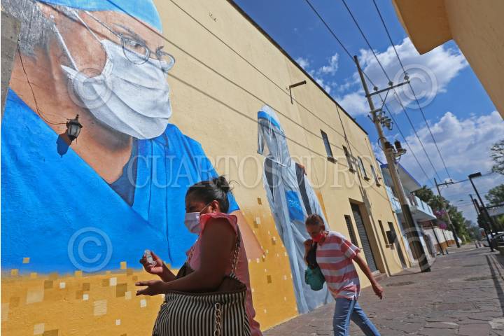 Una mujer con cubrebocas camina por el centro de Zapopan, al fondo se observa el mural Los héroes de la pandemia por Covid-19, una obra que conmemora y reconoce al personal que participa en esta contingencia.