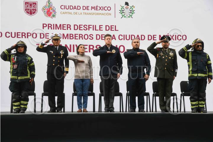 CIUDAD DE MÉXICO, 25ENERO2025.- Myriam Urzúa Vanegas, secretaría de Gestión Integral de Riesgos y Protección Civil; Pablo Vázquez, secretario de Seguridad Ciudadana, y Juan Manuel Pérez, director general del Heroico Cuerpo de Bomberos de la Ciudad de México, encabezaron la ceremonia del primer desfile del Heroico Cuerpo de Bomberos en el marco de su 169 aniversario. Los bomberos marcharon del zócalo capitalino rumbo a al monumento a la revolución. FOTO: MARIO JASSO/CUARTOSCURO.COM