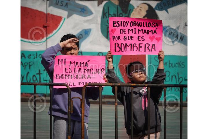 CIUDAD DE MÉXICO, 25ENERO2025.- Niños sostienen pancartas dedicadas a su mamá durante el desfile del Heroico Cuerpo de Bomberos de la Ciudad de México en conmemoración por su 169 aniversario de servicio a la ciudadanía. El recorrido partió en el Zócalo de la Ciudad de México y culminó en Monumento a la Revolución. FOTO: MAGDALENA MONTIEL/CUARTOSCURO.COM