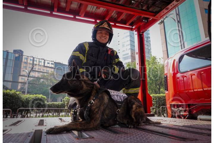 CIUDAD DE MÉXICO, 19SEPTIEMBRE2025.- Un binomio canino del personal del Heroico Cuerpo de Bomberos durante ejercicio hipotético de rescate sobre avenida Juárez durante el Simulacro Nacional 2025 en el marco del aniversario de los sismos de 1985 y 2017. El macro simulacro se realiza con el propósito de fomentar la cultura de la protección civil en la población y contribuir con el fortalecimiento de las capacidades de reacción ante dicho fenómeno natural. FOTO: MARIO JASSO/CUARTOSCURO.COM