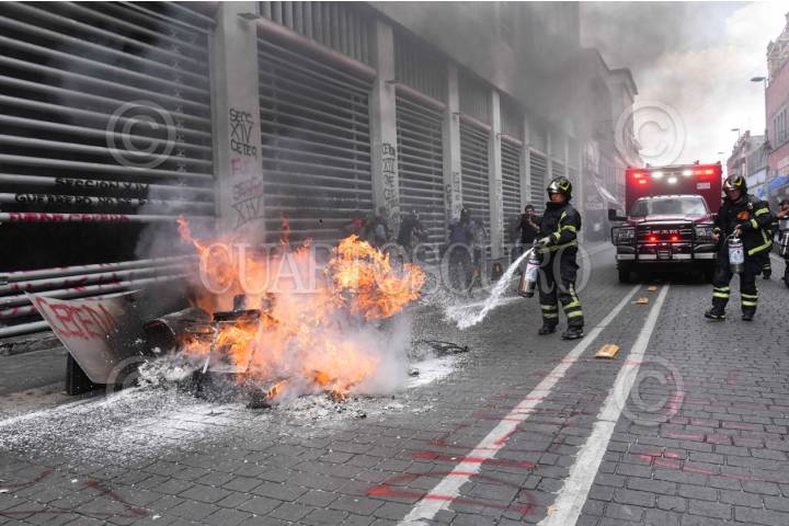 CIUDAD DE MÉXICO, 05JUNIO2025.- Maestros de la Coordinadora Estatal de Trabajadores de Educación de Guerrero (CETEG) irrumpieron la sede del Sindicato Nacional de Trabajadores de la Educación (SNTE) ubicada en República de Venezuela número 44, en donde quemaron diversos objetos y mobiliario de las oficinas, esto en el marco las protestas que el magisterio ha realizado en exigencia de la abrogación de la ley del ISSSTE de 2007. Al lugar arribaron personal del Heroico Cuerpo de Bomberos de la capital para sofocar el fuego. FOTO: MARIO JASSO/CUARTOSCURO.COM