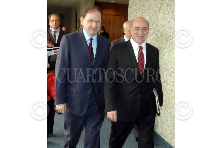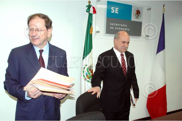 MÉXICO D.F., 28ENERO2008.- Herve Novelli secretario de estado encargado de empresas y comercio exterior de Francia y Eduardo Sojo, secretario de economía al finalizar una reunión en donde ofrecieron una conferencia de prensa. FOTO: RODOLFO ANGULO/CUARTOSCURO.COM