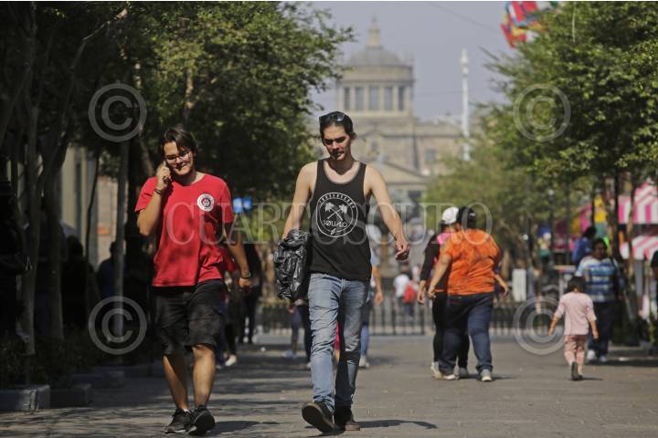 Dos hombres caminan por un andador ubicado en el centro de la ciudad con sus bebidas refrescantes, esto para mitigar la sed que ocasiona el calor.