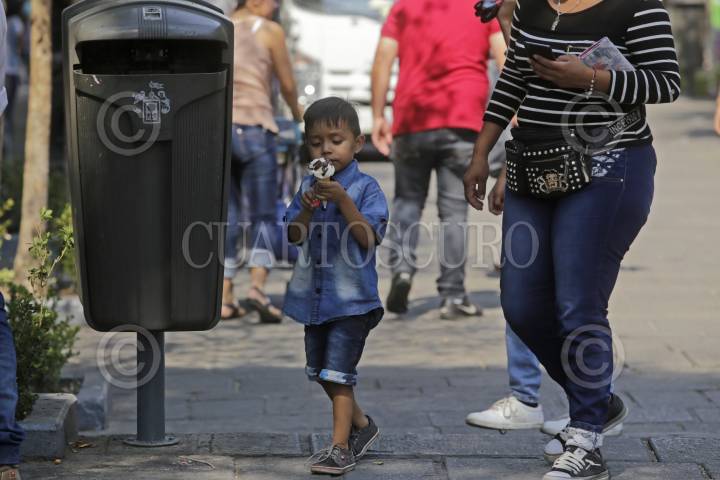 Una pequeña niña bebe su bebida refrescante en el centro de la ciudad, esto para mitigar la sed que ocasiona el calor.