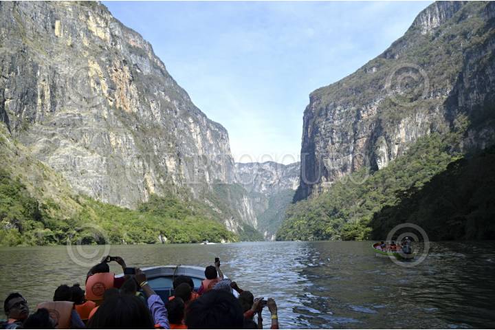 CHIAPA DE CORZO, 27DICIEMBRE2014.-El Cañón del Sumidero, es un estrecho cañón de gran profundidad situado a unos kilómetros de la capital Chiapaneca, esta belleza natural tiene un acantilado de más de 1000 metros y se levanta sobre el río Grijalva que tiene una profundidad de más de 250 metros, inicia en Chiapa de Corzo y desemboca en la presa hidroeléctrica Manuel Moreno Torres conocida como presa Chicoasen , durante sus 32 kilómetros los turistas pueden disfrutar de este imponente lugar donde puedes ver monos araña y cocodrilos principales especies que viven en el cañón. FOTO: ELIZABETH RUIZ /CUARTOSCURO.COM