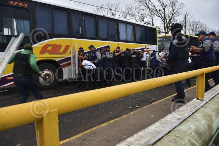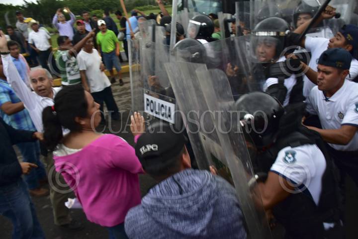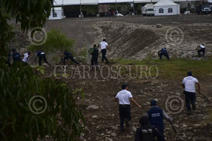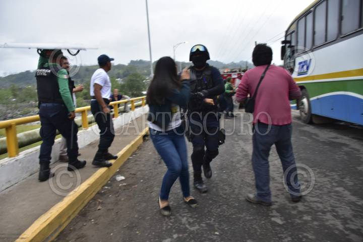 MISANTLA, VERACRUZ 22MARZO2018.- Elementos de la Secretaria de Seguridad Pública desalojaron violentamente a pobladores que protestaban en contra de la privatización del agua señalando que existe un proyecto de hidroeléctrica que se realiza “bajo el agua”, esto en el marco de la visita del presidente Enrique Peña Nieto a la entidad, los manifestantes tenían bloqueado el puente “Palchan” cuando los uniformados los retiraron a golpes. FOTO: ALBERTO ROA /CUARTOSCURO.COM
