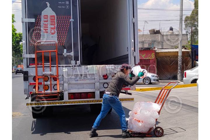 Un trabajador acomoda bolsas de hielo en un diablo en la alcaldía Iztapalapa