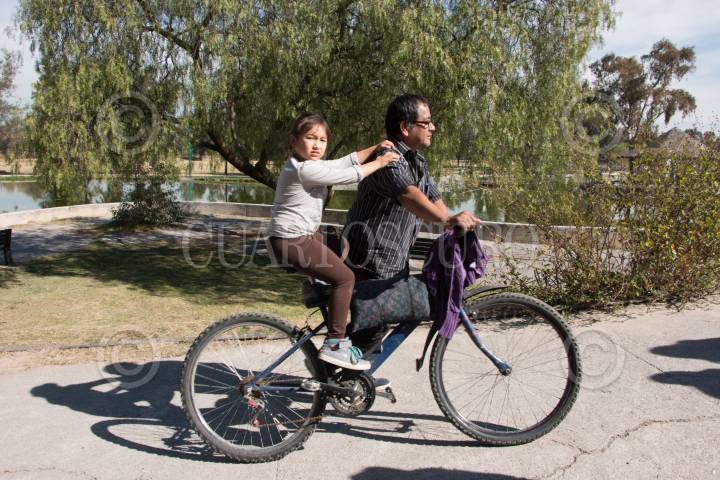 Padre e hija observan la premiación a la bicicleta mejor adornada, al finalizar el octavo Paseo Ciclista del Congreso del Trabajo. FOTO: Francisco Rodríguez/CUARTOSCURO.COM