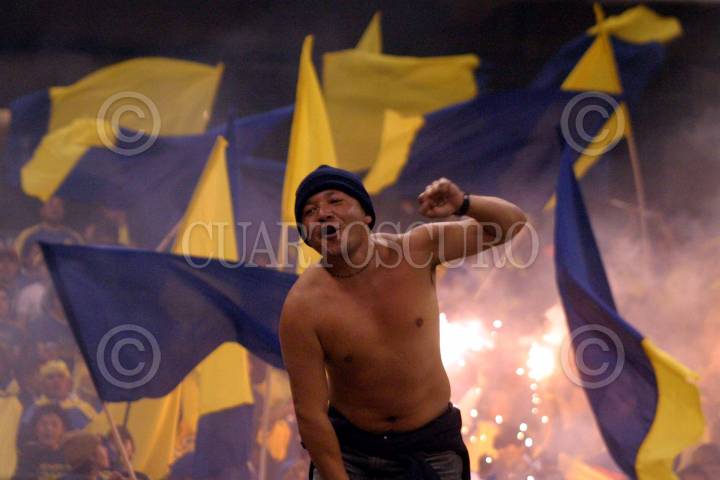 México, D.F., 11FEBRERO2004.- Un hincha del América celebra la victoria de de 3-1 ante Peñarol, quienes se enfrentaron dentro del torneo de la Copa América, el partido tuvó lugra en el Estadio Azteca. FOTO: Moisés Pablo/CUARTOSCURO.COM
