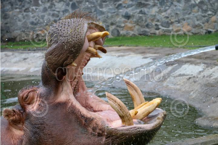 El hipopótamo "Tamba" bebe agua de una manguera que le ofreció su guardián; ha habitado durante 5 años en el Zoológico Parque del Pueblo Nezahualcóyotl