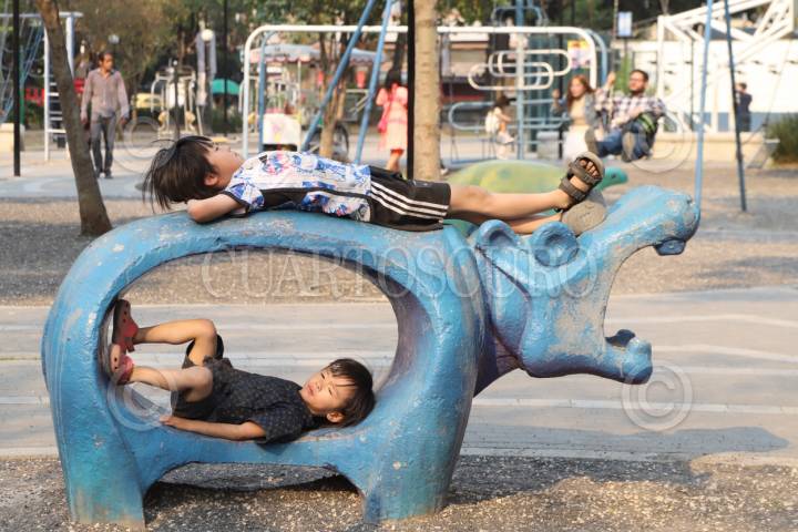 CIUDAD DE MÉXICO, 28MARZO2024. Niños descansan en un hipopótamo, aprovechan los días de vacaciones de Semana Santa en un parque de la Colonia Roma. FOTO: EDGAR NEGRETE LIRA/CUARTOSCURO.COM