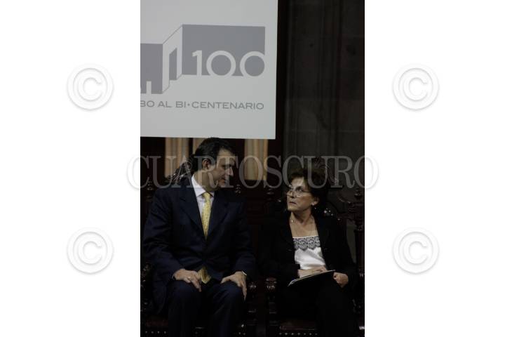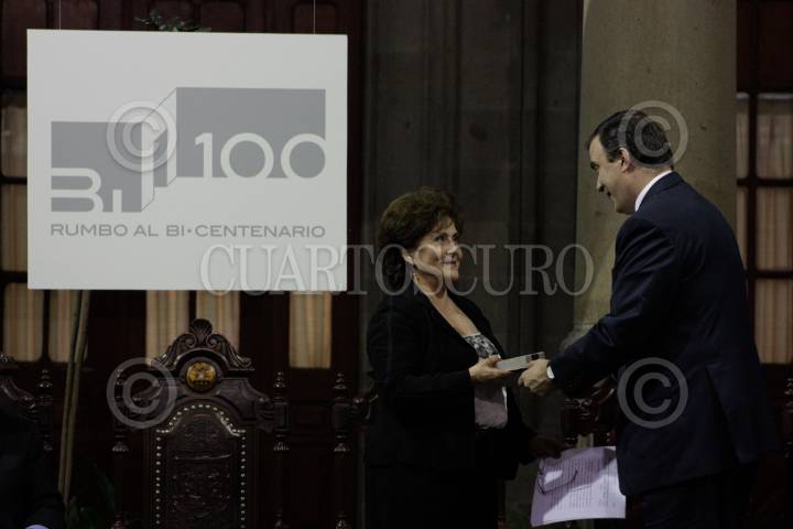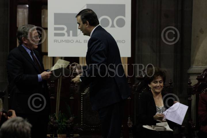 MÉXICO, D.F., 20NOVIEMBRE2009.- Marcelo Ebrard Casaubón, jefe de gobierno capitalino, entregó la Medalla 1808 a la Doctora Alicia Hernández, en representación del historiador Eric Van Young, en el Palacio del Ayuntamiento. FOTO: ESSENE HERNÁNDEZ/CUARTOSCURO.COM