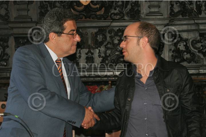 MÉXICO, D.F., 13OCTUBRE2010.- Ernesto Velázquez Briseño, director general del TV UNAM saluda a Inti Muñoz Santini, director general del Fideicomiso Centro Histórico, en conferencia de prensa donde anunciaron el inició de las transmisiones de KM CERO TV Noticias del Centro Histórico. FOTO: SAÚL LÓPEZ/CUARTOSCURO.COM