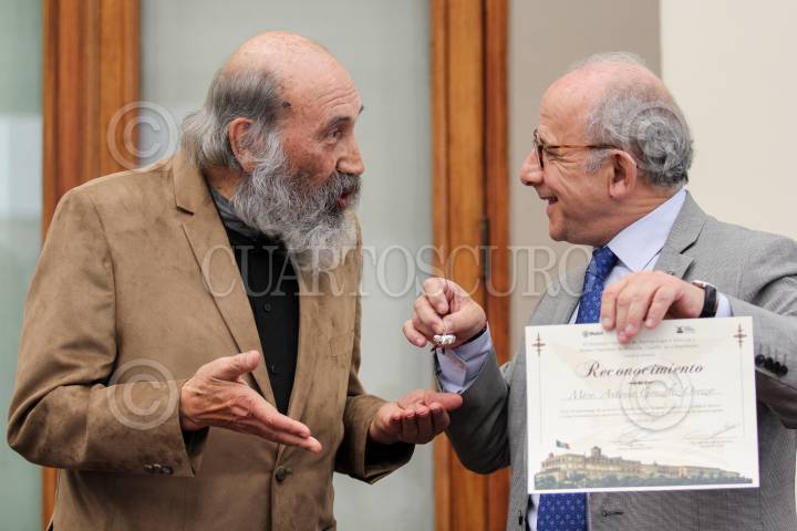 CIUDAD DE MÉXICO, 13JULIO2017.- El muralista Antonio González Orozco y Diego Prieto, director general del Instituto Nacional de Antropología e Historia (INAH), durante el homenaje al muralista por su obra plasma en una de las paredes del Castillo de Chapultepec que muestra el momento de la entrada triunfal de Benito Juárez a la Ciudad de México con el ejército libertador, esto con motivo del 150 aniversario del hecho histórico. FOTO: GALO CAÑAS /CUARTOSCURO.COM