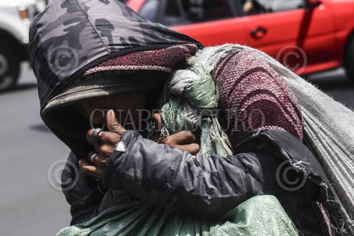 CIUDAD DE MÉXICO, 24MAYO2025.- Un hombre carga costales sobre el eje central en el Centro Histórico. FOTO: MARIO JASSO/CUARTOSCURO.COM