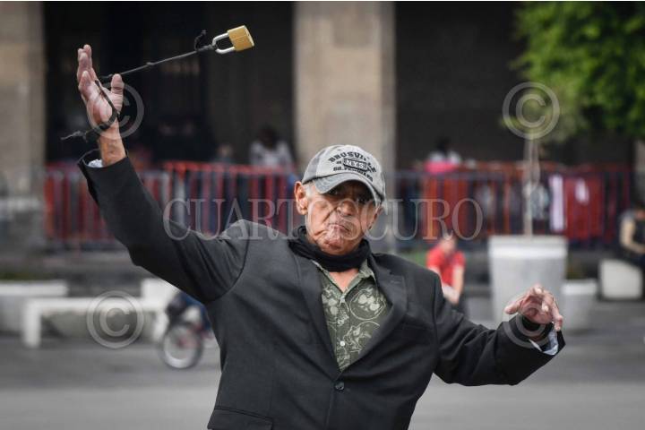 CIUDAD DE MÉXICO, 17JUNIO2025.- Un adulto mayor "juega" con un candado atado a un listón mientras camina por la plancha del zócalo capitalino. FOTO: MARIO JASSO/CUARTOSCURO.COM
