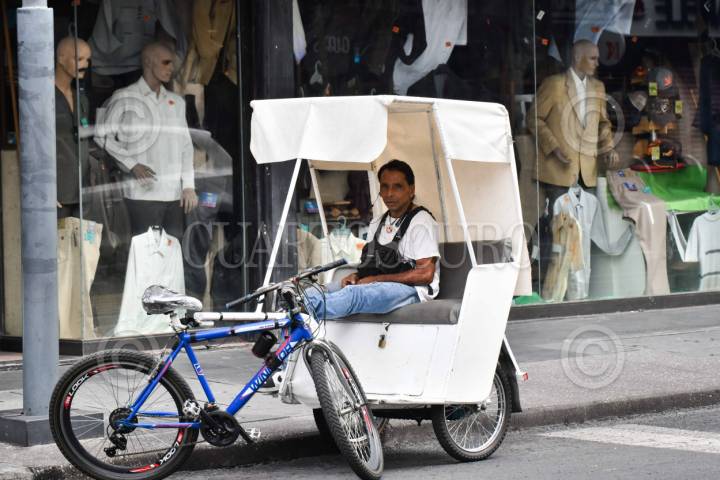 CIUDAD DE MÉXICO, 17JUNIO2025.- Un conductor de bicitaxi espera pasaje sobre la calle José María Pino Suárez en el centro histórico. FOTO: MARIO JASSO/CUARTOSCURO.COM